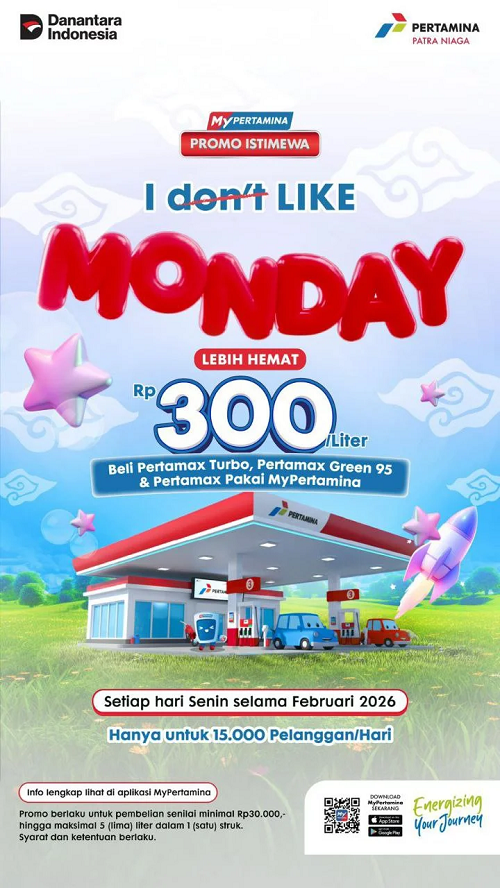 Lewat promo “Semangat Senin, Makin Hemat”, pelanggan bisa menikmati potongan harga Rp300 per liter untuk pembelian Pertamax Turbo, Pertamax Green 95, atau Pertamax minimal Rp30.000 menggunakan aplikasi MyPertamina. Promo berlaku setiap Senin sepanjang Februari 2026 di SPBU yang telah terintegrasi layanan digital tersebut, dengan kuota 15.000 konsumen per hari.